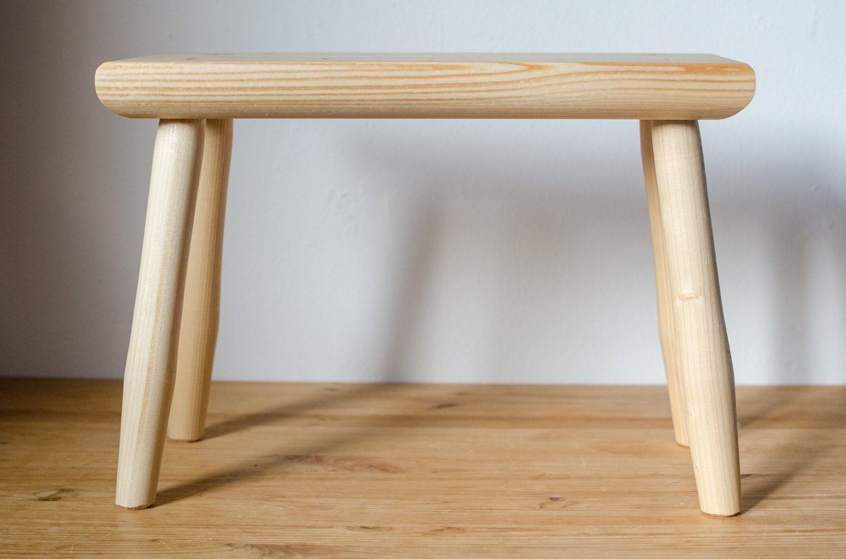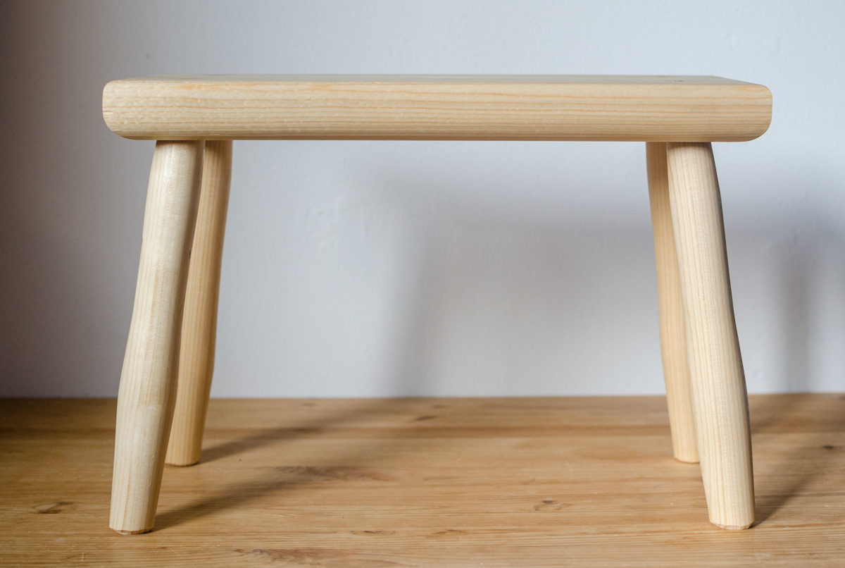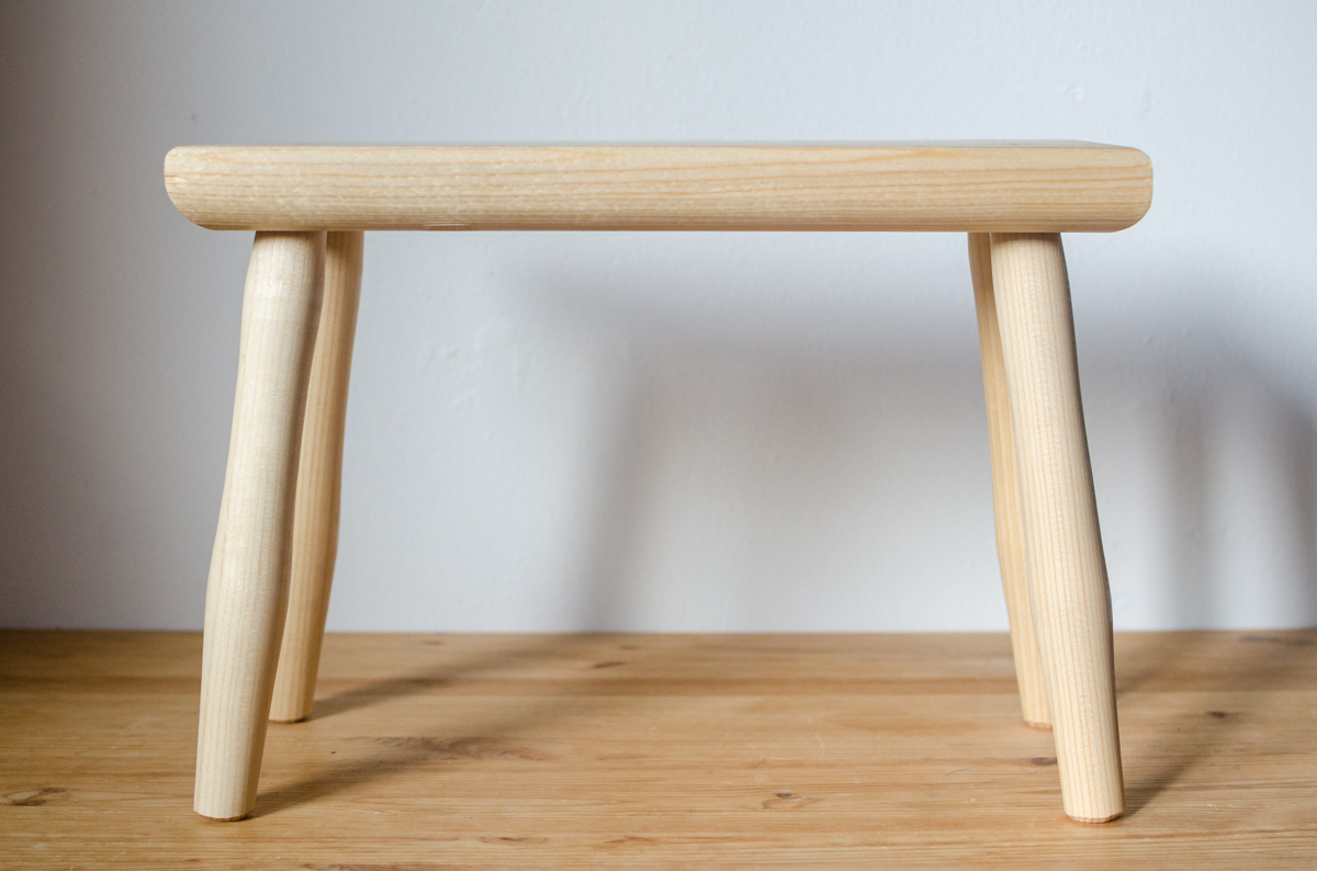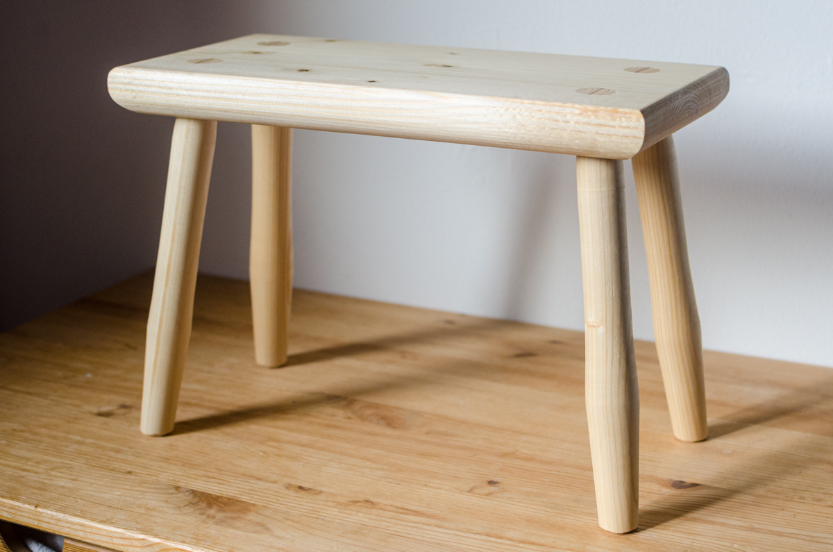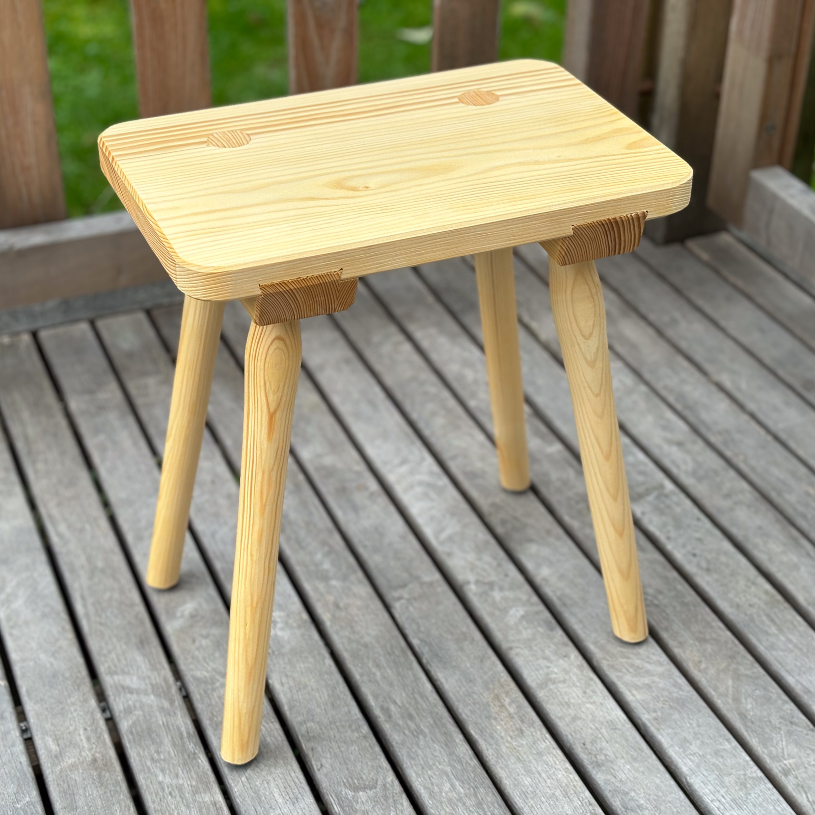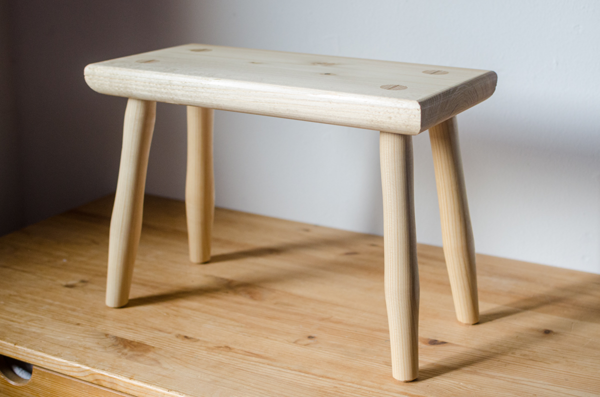 Sitzhocker mit doppelt konischen Gratleisten und teildurchgehenden Zapfen, Fichte1 (Kl. 0/I), Naturleim, Schellackoberfläche. Zapfen mit Keilen aus Hartholz (Buche, Esche) versehen. Optional ohne Griff (-50€)