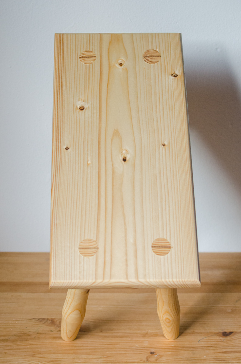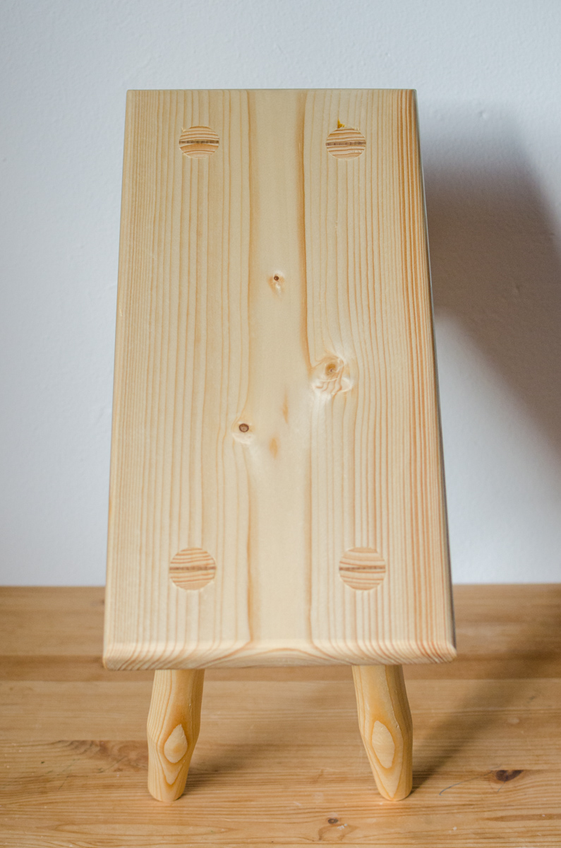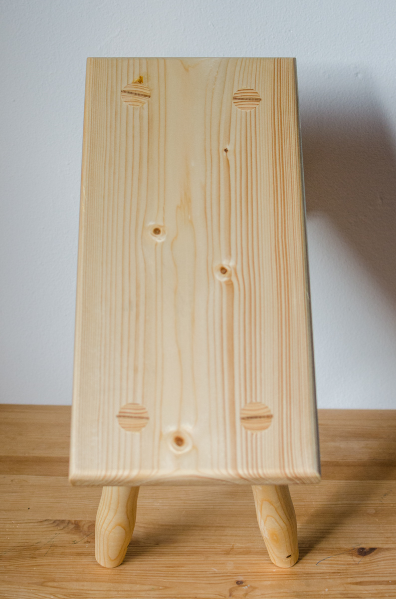 Fußhocker mit konischen Zapfen, Fichte1, Naturleim, Schellackoberfläche. Zapfen mit Keilen aus Hartholz (Buche, Esche) versehen.